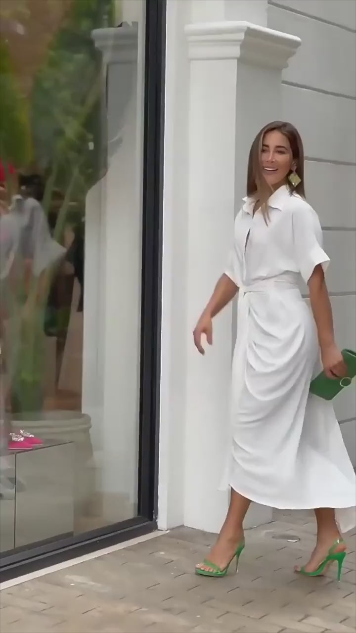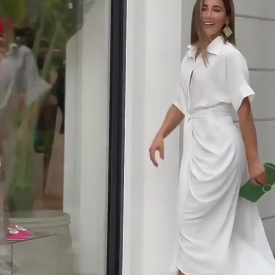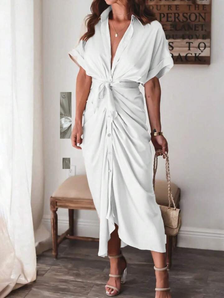 Button down belted shirt dress in white