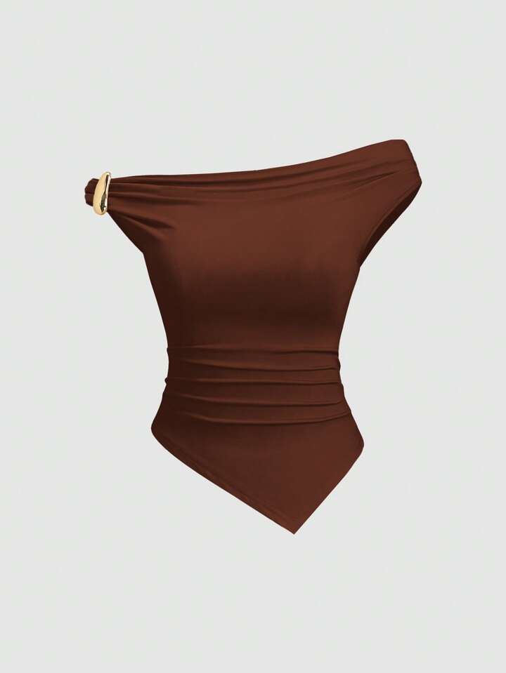 Metal decor twist hem asymmetric top in brown