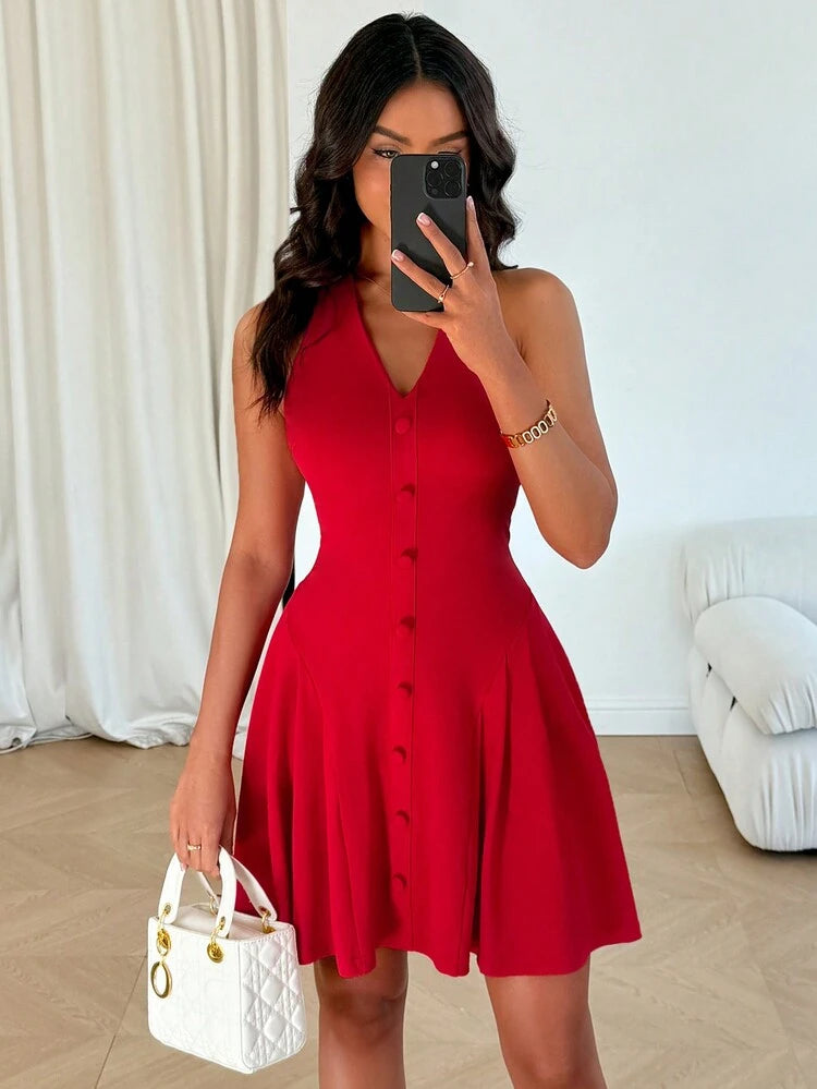 Solid cinched waist a-line dressin red