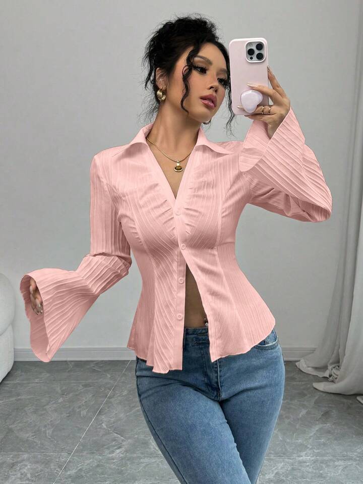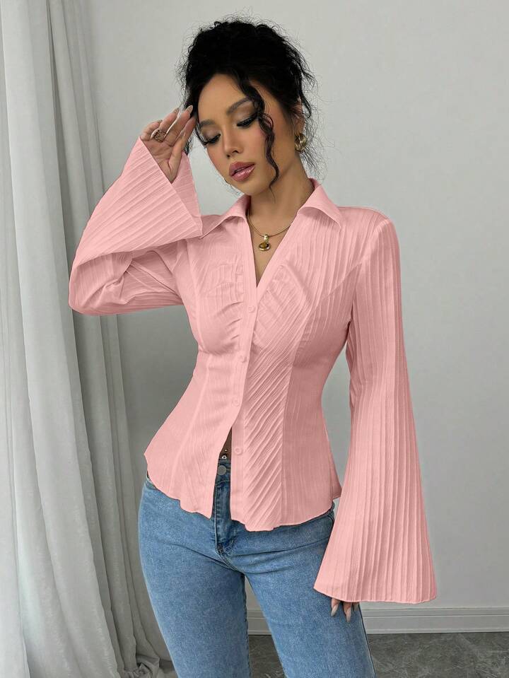 V neck collared ruched waist blouse in pink
